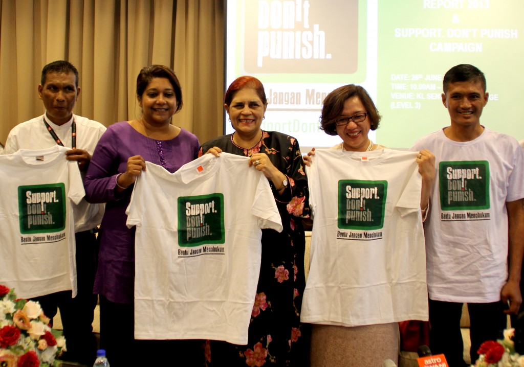 Speakers at the press conference on the launch of the Support. Don’t Punish. Global Day of Action, held on 26 June 2014 in Kuala Lumpur, holding the Malaysian customised campaign t-shirts in support of improving access to treatment for and ending criminalisation of people who use drugs.